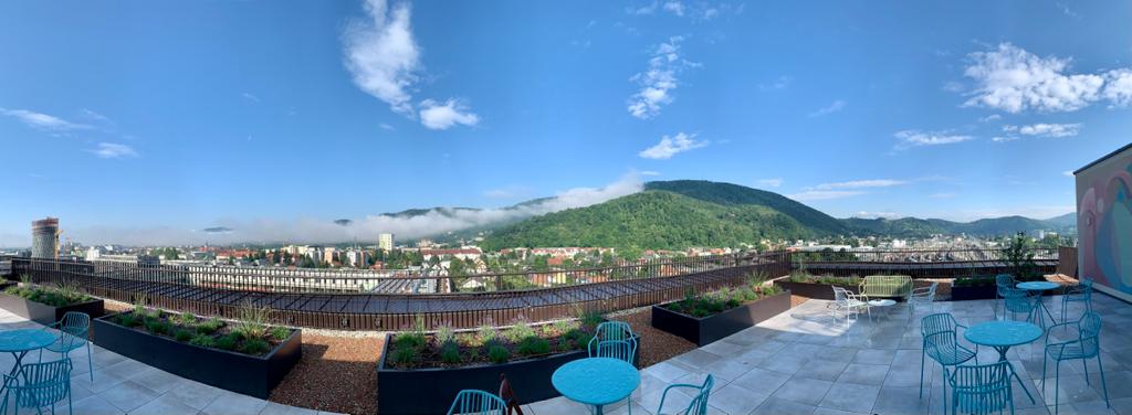 Panorama z miejsca pracy rozciąga się od centrum Grazu po pasmo Plabutsch-Buchkogel (pokażemy Ci, co to jest, gdy nas odwiedzisz 😊). Resztę widoku 360° możesz podziwiać podczas przerwy na herbatę lub kawę na tarasie dachu! Czy już wspomnieliśmy, że mamy świetną kawę?